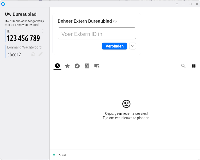 Vervolgens is de applicatie klaar voor samenwerking. Er wordt automatisch een uniek ID gegeneerd en een eenmalig wachtwoord. Geef deze gegevens telefonisch door tijdens het gezamenlijk overleg.